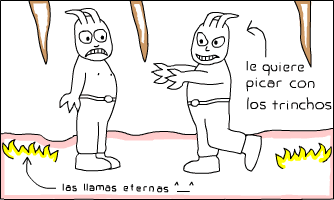 Entonces los diablos se lo pasan de puta madre riendo todo el día (¡!) y vacilando entre ellos. A veces se hacen maldades entre sí porque las almas mortales no aguantan mucho. Cuando se meten con un alma mortal terminan por desmadrarla con sus trinchos de fueGo. Por eso mejor se hipnotizan entre ellos y luego se convierten en alimañas o se hacen humo venenoso.